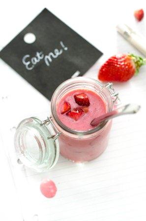 - Add all ingredients to a food processor and blend until smooth. Stir through some extra chopped strawberries. (optional)